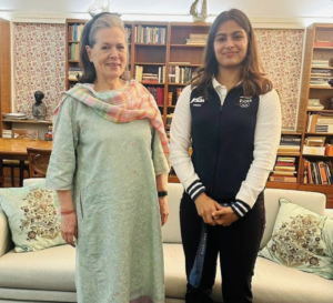 Paris Olympics 2024:भारत की डबल मेडल विजेता निशानेबाज मनु भाकर पेरिस ओलंपिक में ऐतिहासिक प्रदर्शन के बाद 7 अगस्त को भारत लौटी चुकी है। मनु भाकर के लौटने पर दिल्ली के इंदिरा गांधी इंटरनेशनल एयरपोर्ट पर मनु भाकर का शानदार तरीके से स्वागत किया गया। भारत लौटने के बाद मनु भाकर ने सोनिया के आवास 10 जनपथ पर कांग्रेस की पूर्व अध्यक्ष व मौजूदा राज्यसभा सांसद सोनिया गांधी संग मुलाकात की।