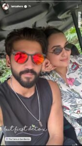 वही ज़ाहिर ने एक और अन्य तस्वीर इंस्टाग्राम स्टोरी पर शेयर की। तस्वीर में नवविवाहित जोड़े को चेहरे पर चमक के साथ एक गाड़ी के अंदर बैठे देखा गया। उन्होंने पूल के साथ उनके होटल के कमरे के बाहर के सुंदर दृश्य की भी झलक पेश की।